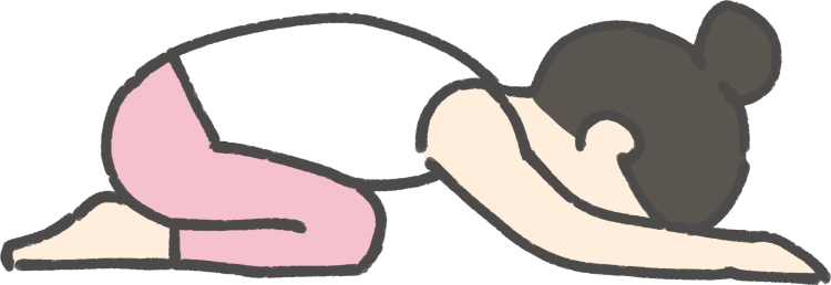 両手を重ねた上におでこを乗せて休めるか、おでこを直接マットの上に休め両腕を前方に伸ばします。両腕は前方に伸ばす代わりに、体側の横に添えても構いません。(両腕を心地よい方向に伸ばし、ご自身にとって無理のない姿勢を探してみてください。)