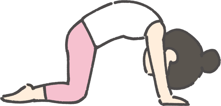 四つんばいの姿勢、猫のポーズ、牛のポーズのような姿勢では、肘の過伸展に注意する必要があります。過伸展を避けるためには、肘を一度深く曲げて、そこから少しずつ肘を伸ばし、伸ばしきる直前に動きを止めて、その腕の位置をキープするようにしてみてください。こうすることで、しっかりと二の腕の筋肉を使うことが意識できるため、結果的に二の腕の引き締めにも繋がります。