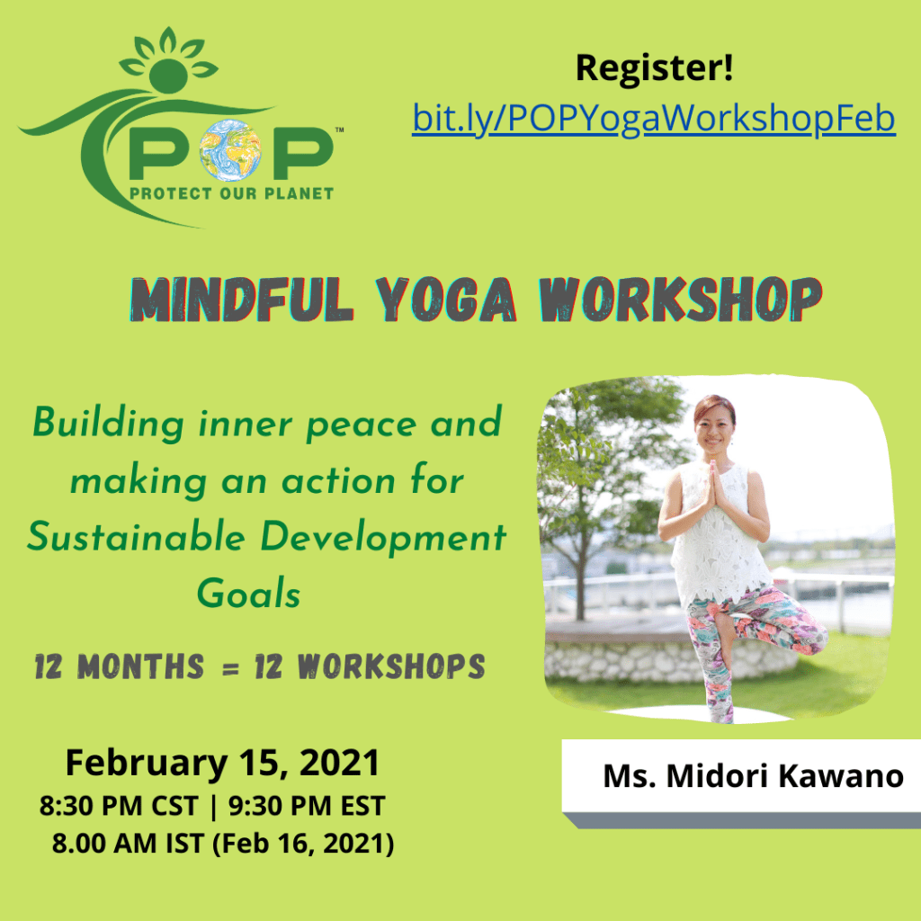 そして昨年2020年、POPという素晴らしい活動団体と出会うことができ、今年2021年から一年間「マインドフル・ヨーガ」を通じて、ヨーガとSDGsの接点についてのワークショップを行う機会を頂きました。このような夢のような出来事の数々に心から感謝するとともに、これまでにヨーガから学んだ智慧を一人でも多くの方々と共有しながら、私たちの住む地球を守るためにその智慧を使うことができましたらこの上ない幸せです。
